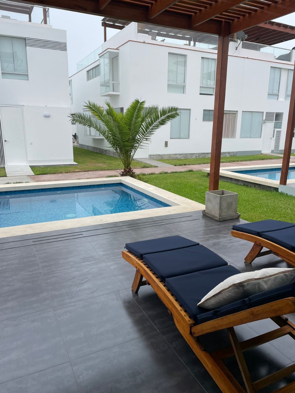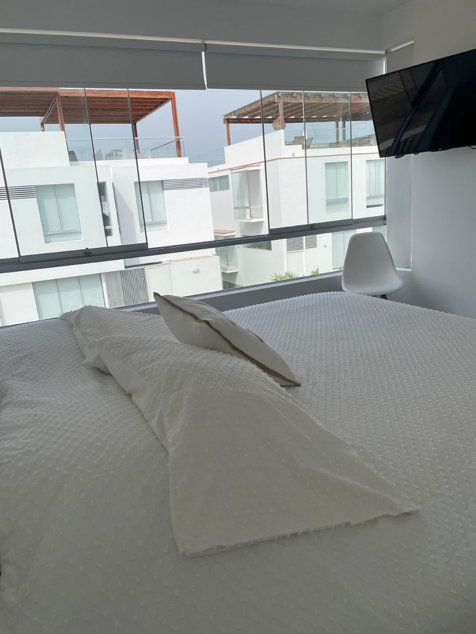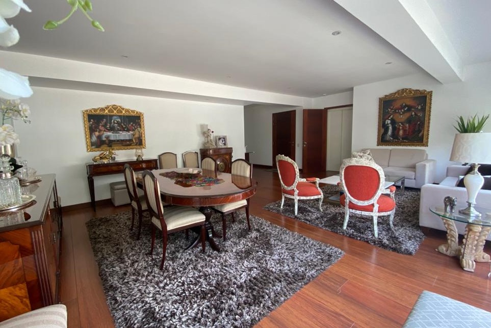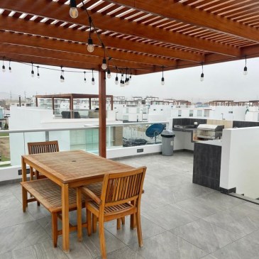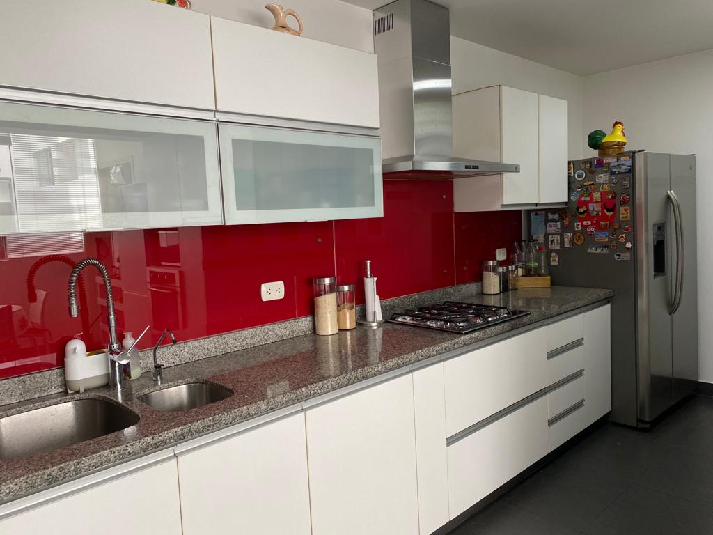 DISTRIBUCIÓN: 3 dormitorios con baño propio + baño visita, sala – comedor, cocina, lavandería, cuarto y baño de servicio, sala de estar, terraza amplia de 35.44 M2 con parrilla y ovalín con mamparas de vidrio templado, 2 estacionamientos, depósito, etc.